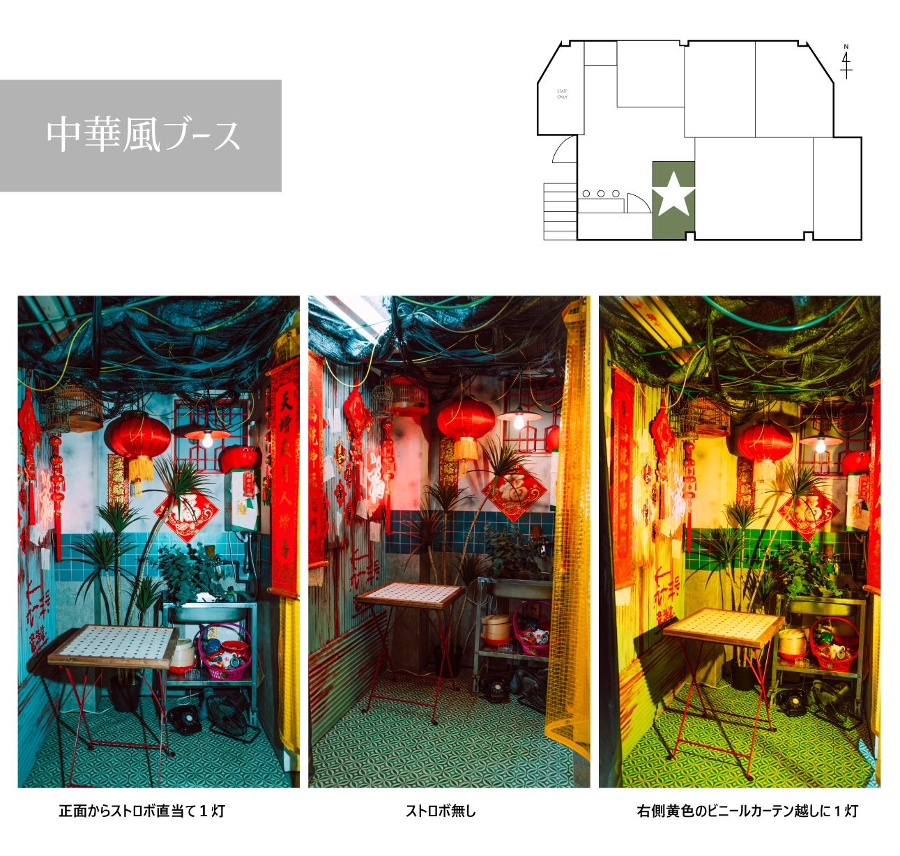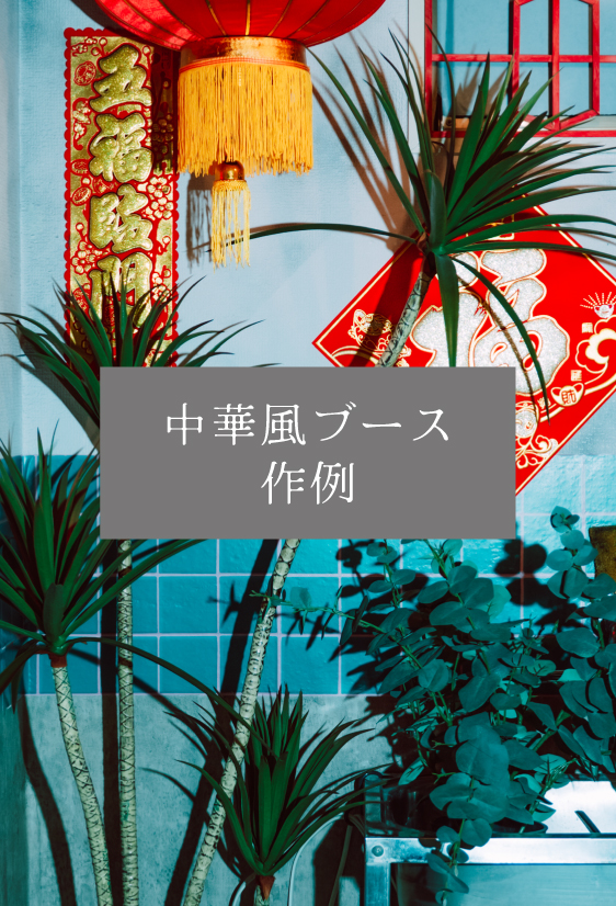 グリーン背景に、背景紙スタンドを使い、中華風ブースの装飾を吊るしています。ピンクの傘も、中華風ブースにありますのでご利用ください。