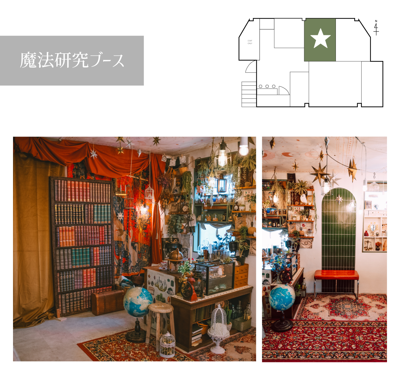 魔法研究ブースの前に、背景紙スタンドを使ってベルベットカーテンをかけたアレンジです。