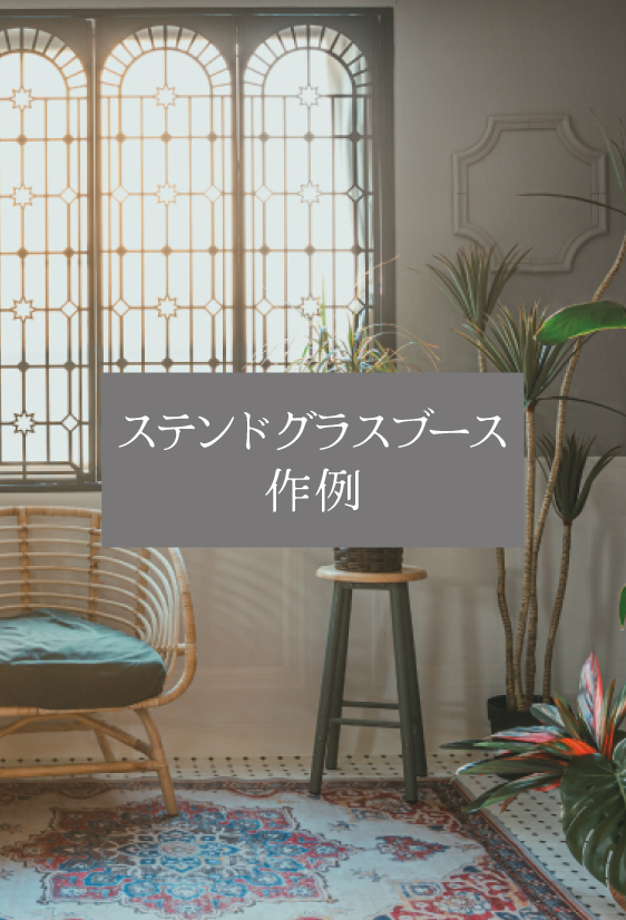 ステンドグラスブースでチャイナテイストのコーディネートをしたサンプルです。窓回りの飾り付けはスタッフにて行います。お持ち込みのアイテムを窓へ飾り付ける場合は事前にスタッフに確認をお願いします。