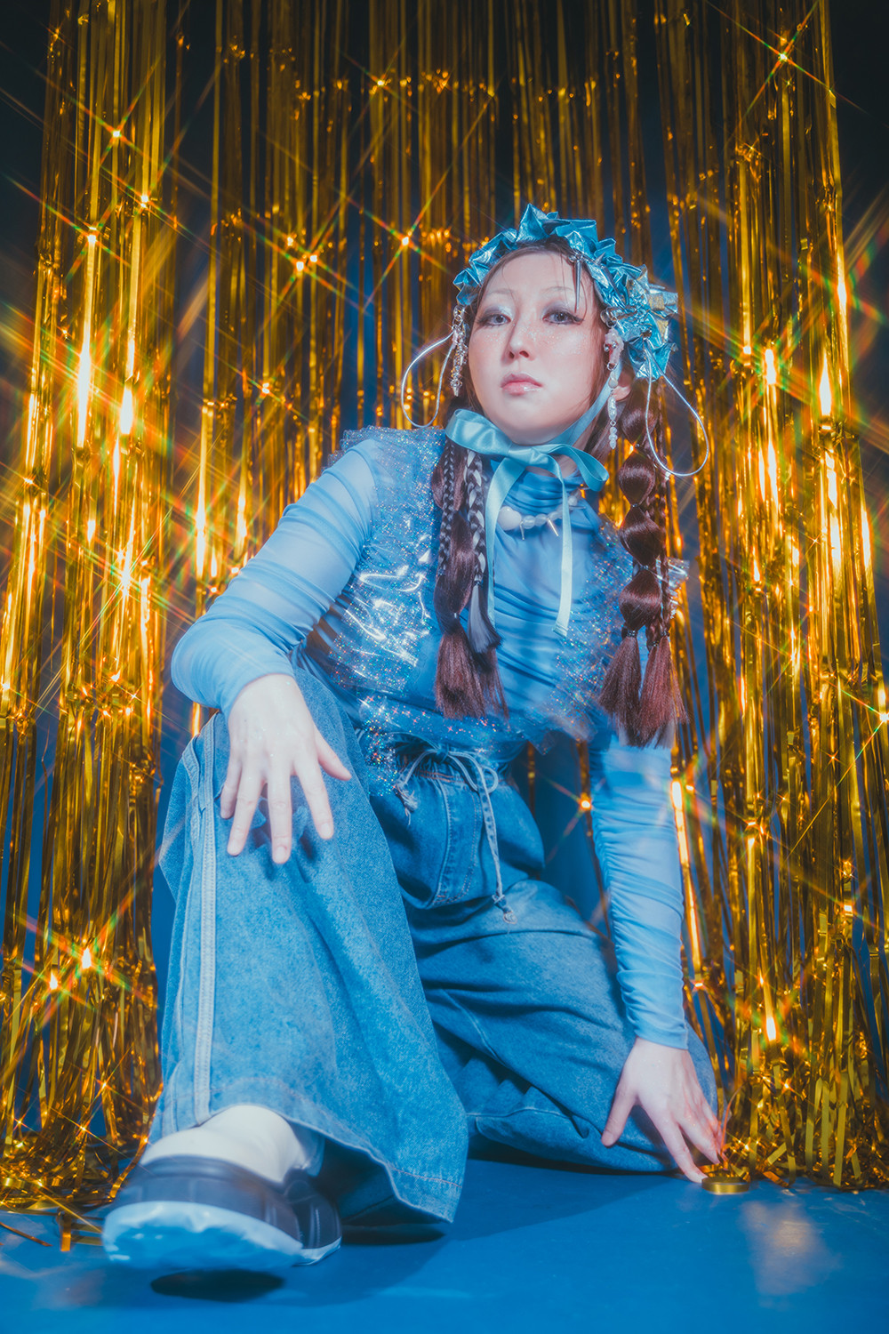 ネイビーの背景紙で、ギラギラテープをライトスタンドで設置して、クロスフィルターを使った作例です。