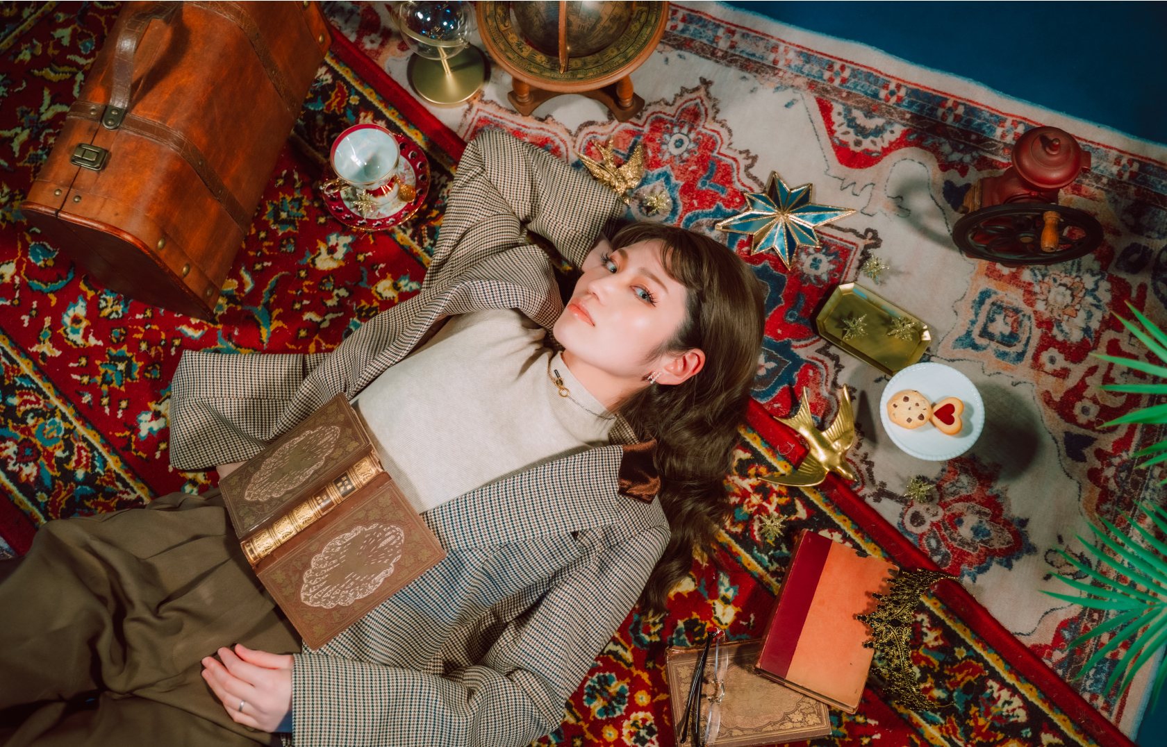 ネイビーの背景紙にカーペットを敷いて、真上から撮影。